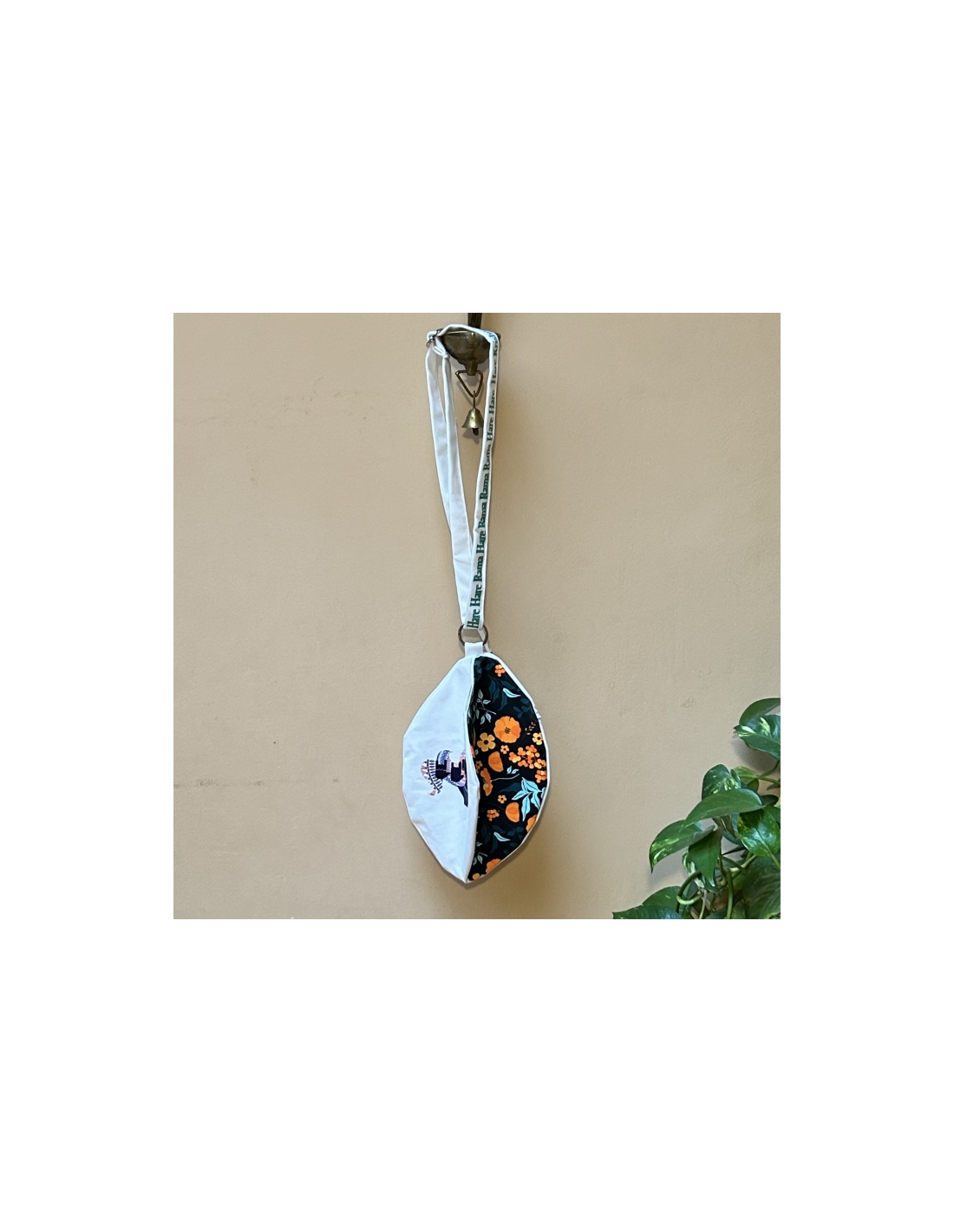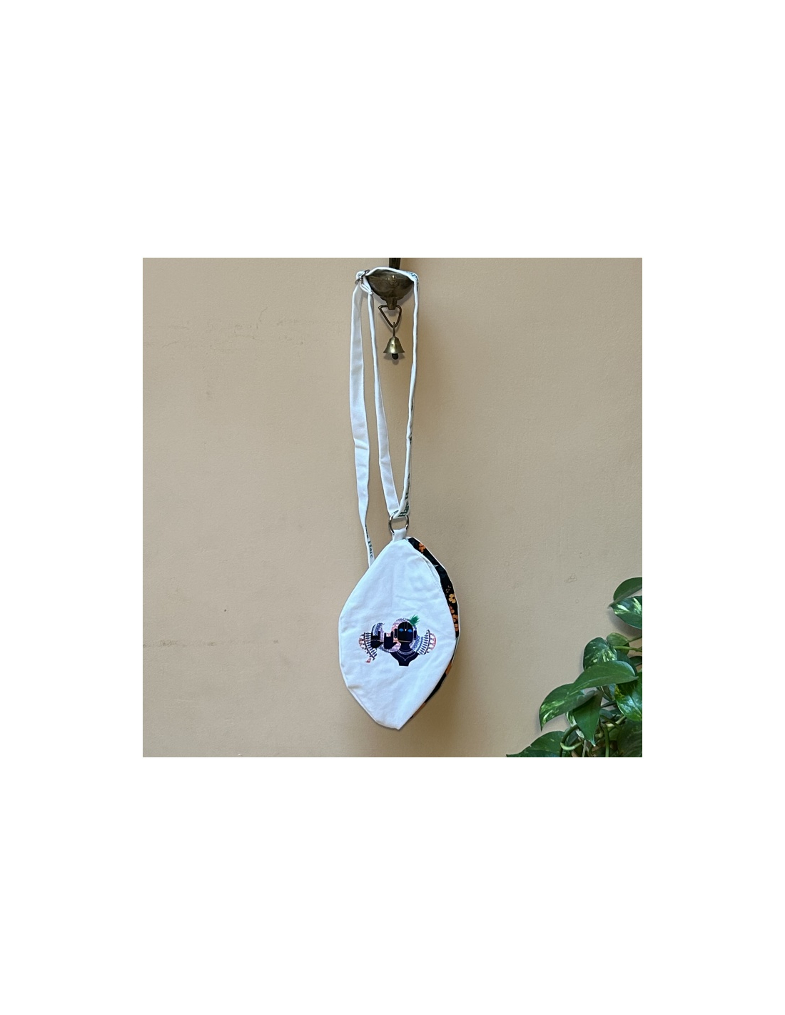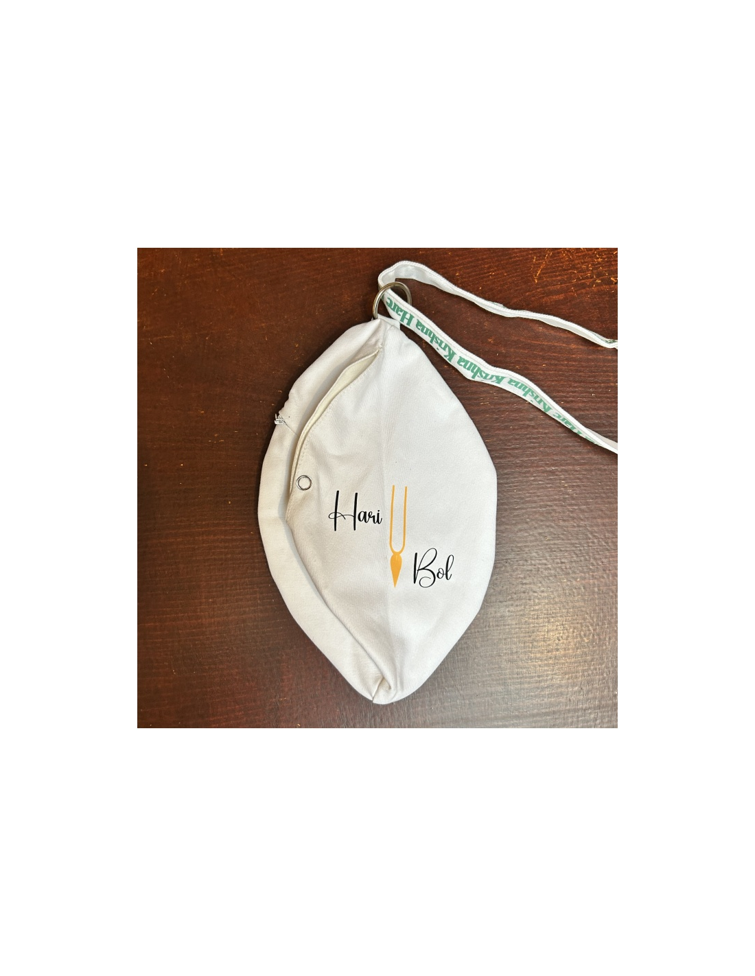 Kvalitní prostorný bavlněný japa pytlík na růženec s potiskem Krišny s flétnou na horní straně, další strana zprava má květinový vzor, strana zleva má znak tilaku a Haribol. Na zadní straně je kapsička pro počítadlo s nenápadně šikmo všitým měkkým zipem.
