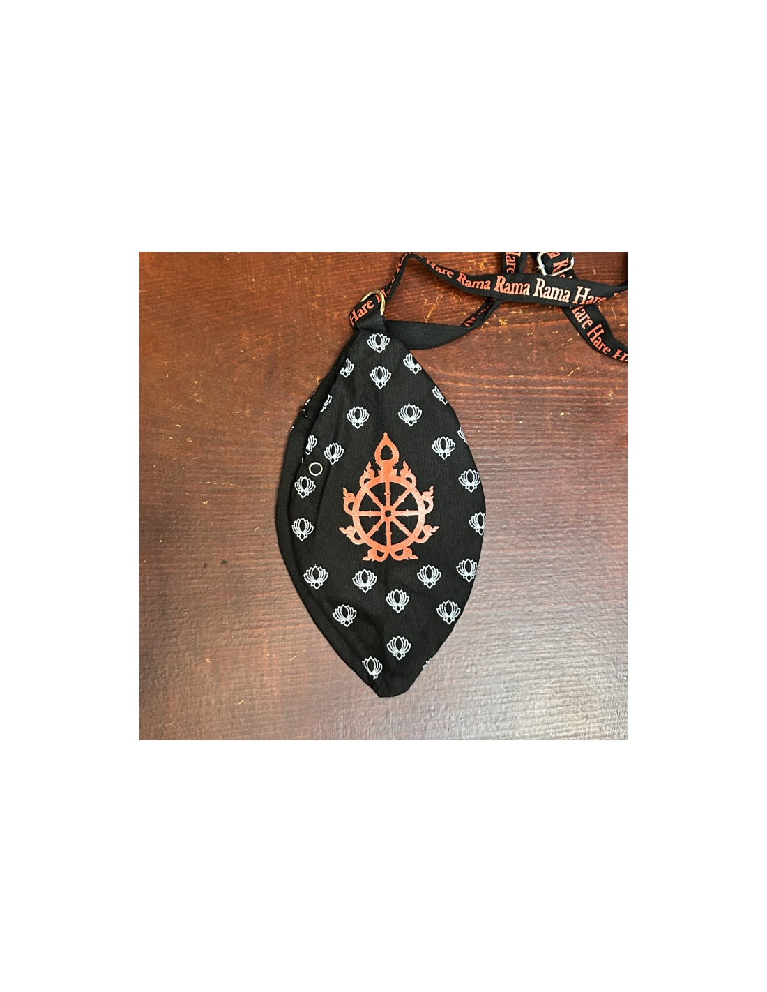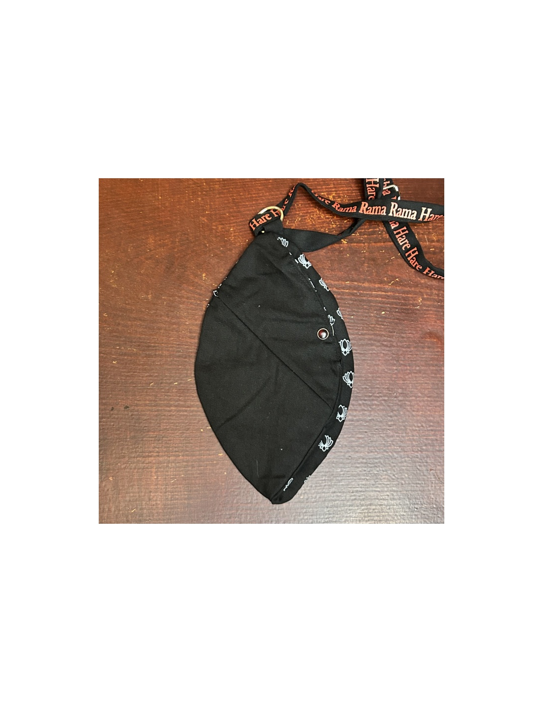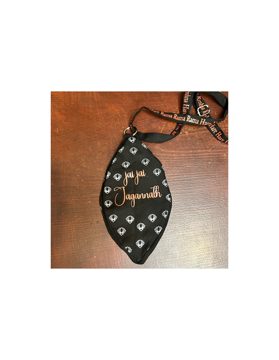 Kvalitní prostorný bavlněný japa pytlík na růženec s potiskem hlavy Jagannáítha na horní straně, na další straně zprava je červený nápis "jai jai Jagannáth", na další straně zleva je červený znak Sudaršana čakry. Na spodní straně je kapsička pro počítadlo s nenápadně šikmo všitým měkkým zipem.