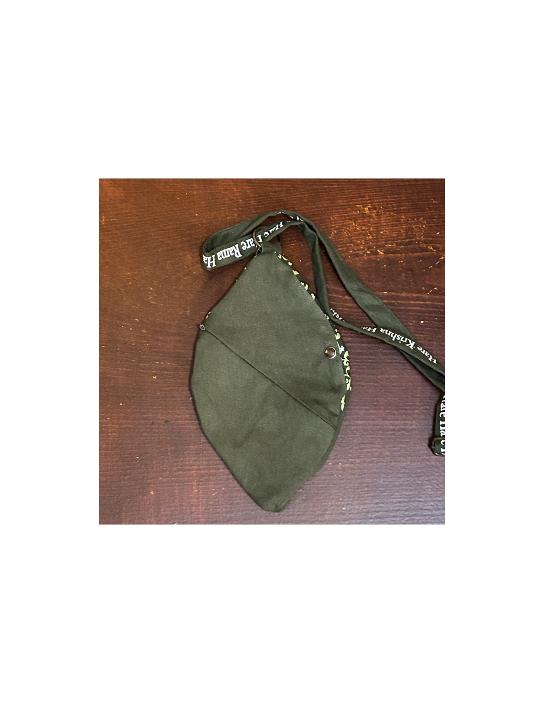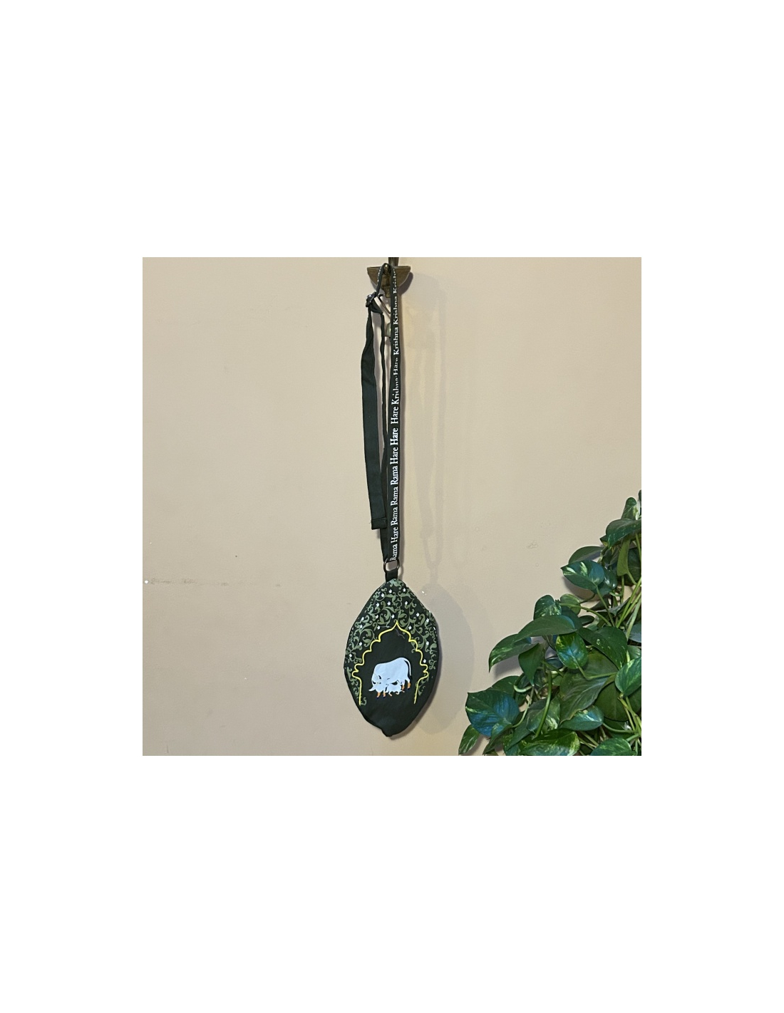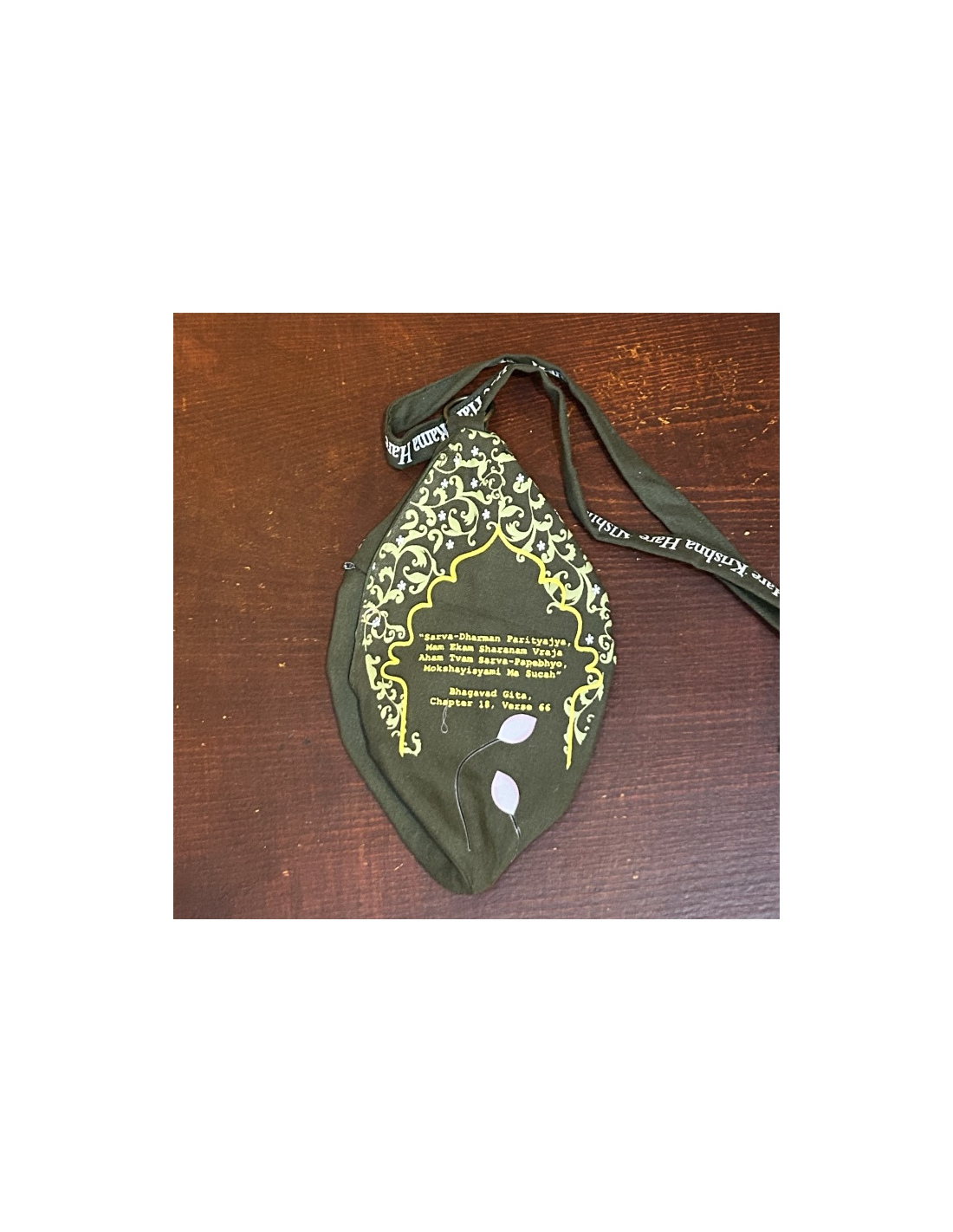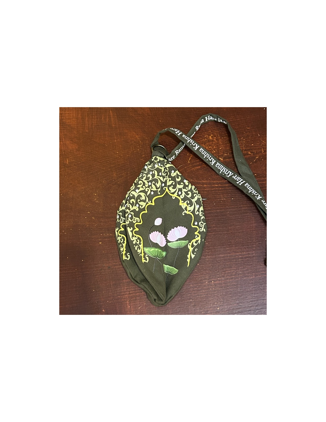 Kvalitní prostorný bavlněný japa pytlík na růženec s potiskem kravičky Surabhi s telátkem na horní straně, na další straně zprava jsou růžové lotosy, na další straně zleva je citát z Bhagavad-gíty verš 18.66. Na spodní straně je kapsička pro počítadlo s nenápadně šikmo všitým měkkým zipem.