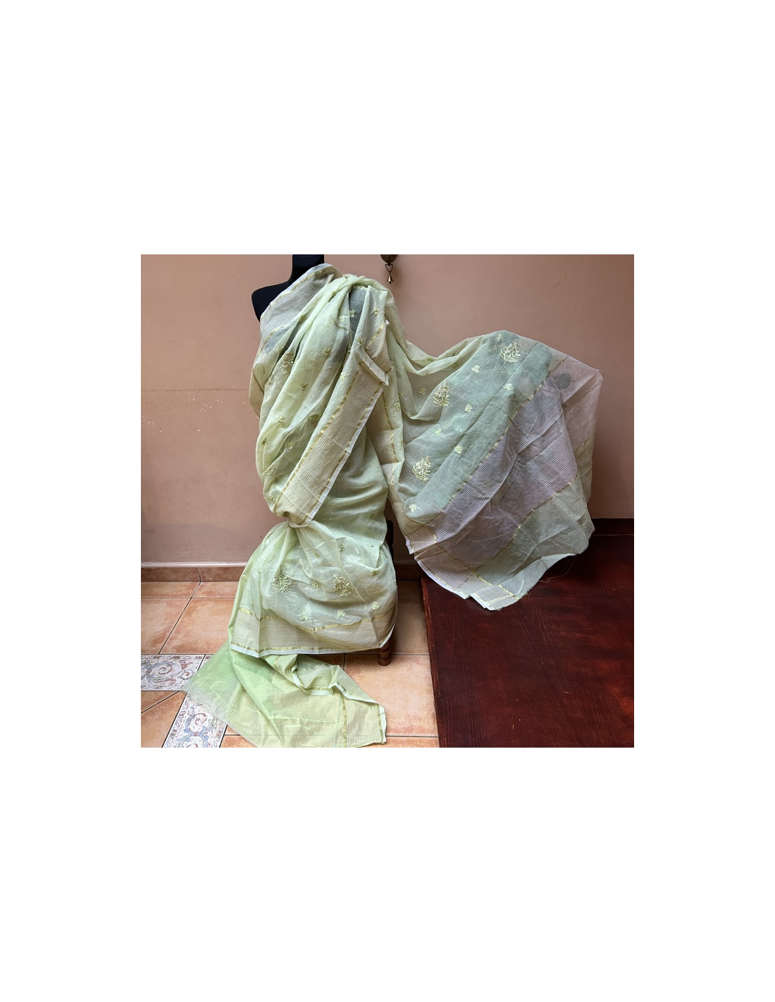 Sárí z pevné viskózy jemně zlené barvy sse strojovou výšivkou. Zahrnuje i materiál na blúzku nebo čolí (na foto vlevo na zemi).