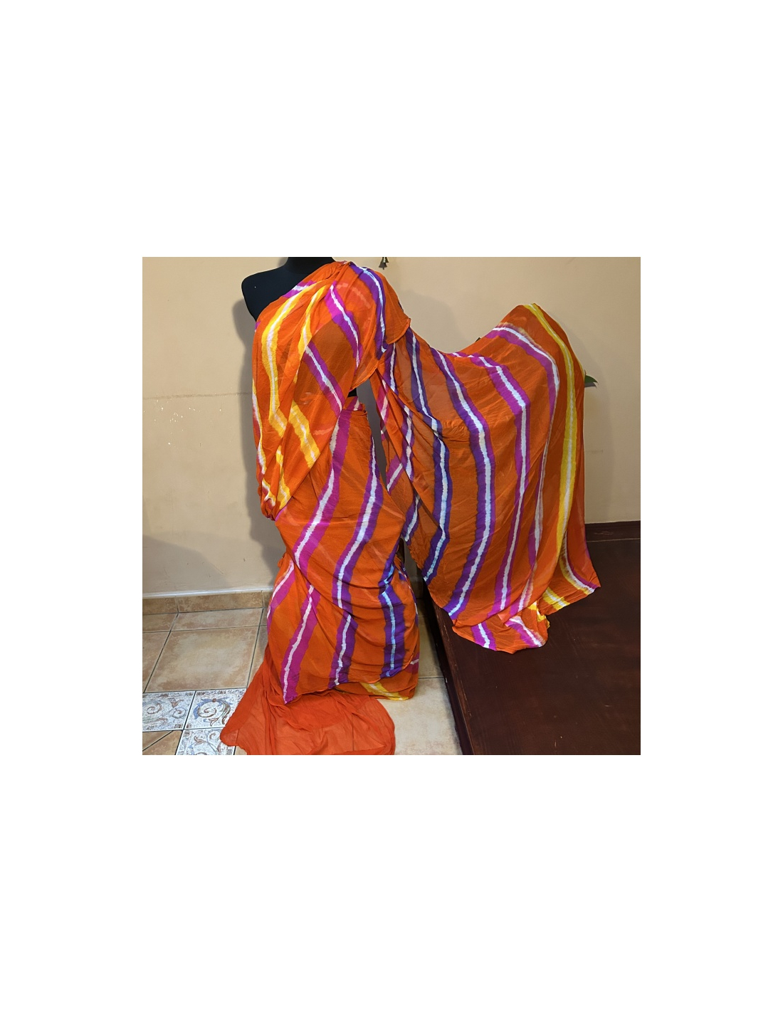 Zajímavé pruhované sárí s látkou na blúzku/čolí (na foto vlevo na zemi). Příjemný viskozový materiál.