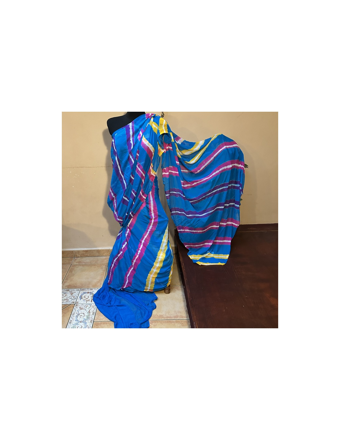 Zajímavé sárí s pruhy s látkou na blúzku/čolí (na foto vlevo na zemi). Příjemný viskózový materiál.