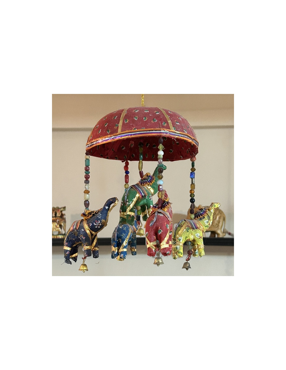 Červený slunečník se závěšenými pěti slony (bavlna) se zvonečky. K výběru červení sloni nebo každý jiné barvy.